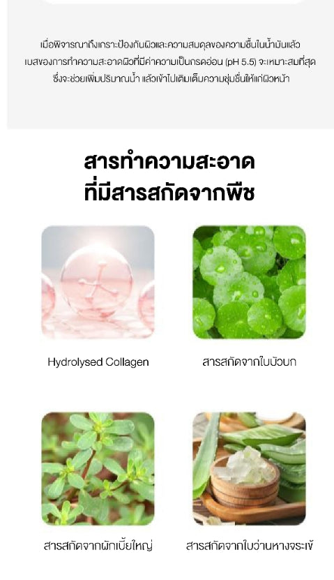 Contains plant extraction cleaning ingredients : Portulaca Oleracea Extract, Hydrolyzed Collagen, Centella Asiatica Extract, Aloe Barbadensis Leaf Extract,